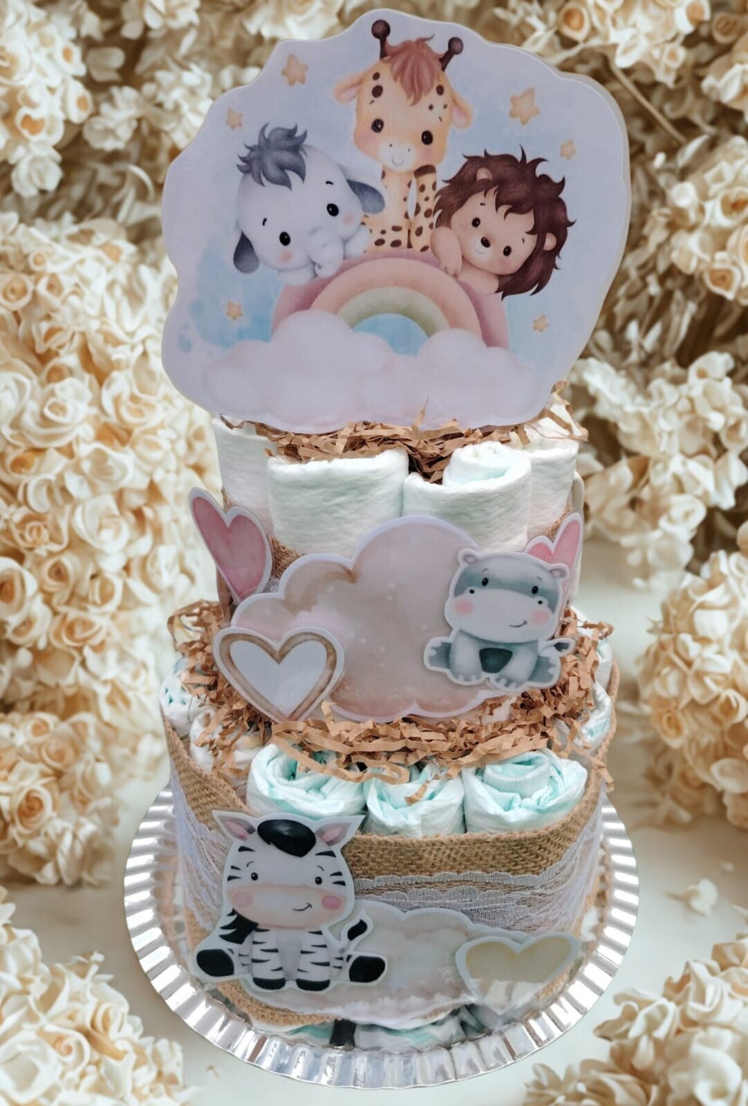 Nuestra encantadora Tarta de Pañales es la elección perfecta. Decorada con adorables animales de la selva y suaves tonos pastel, añade un toque de dulzura a cualquier celebración.